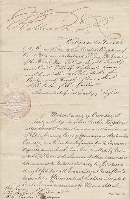 (1765 - 1837) King of England who resisted a halt to the slave trade, and was the last king to attempt to force a Prime Minister on Parliament. Partly-printed D.S., 2pp. sm. folio, Court of St. James, June 26, 1835. The King forwards to Charles, Duke of Richmon an order that certain officers' commission be thereafter signed by the king's "Lieutenants", with Charles to represent the County of Sussex. Co-signed by Prime Minister JOHN RUSSELL (1792-1878) at bottom. Slight toning and fold wear aelse very good, with a huge signature by the king.