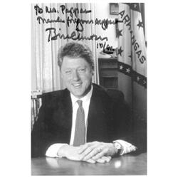 <b>1016. WILLIAM J. CLINTON</b> (b. 1946) Forty-second President of the United States, the first elected president to be impeached. I.S.P. as presidential candidate, 4" x 6" color, a nice candid image of Clinton seated at his desk, inscribed "<i>Thanks for your support</i>" and boldly signed. Sold with an S.P. 5" x 7" b/w, a formal portrait of First Lady <b>HILLARY RODHAM CLINTO</b>N, signed in full. Two pieces, fine. <b>$300-400</b>