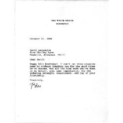 <b>311. WILLIAM J. CLINTON </b>Nice content T.L.S. "<i>Bill</i>" as President on White House letterhead, 1p. large 8vo., Washington, Oct. 30, 1996 to his friend in Arkansas, David Leopoulos. In part: "<i>...Happy 50th Birthday! I can't let this occasion pass by without thanking you for the good times we've shared, for all the fine work you've done on my behalf, and, most importantly, for the enduring strength, reassurance, and joy of your friendship..."</i> Very fine. <b>$400-600 </b>
