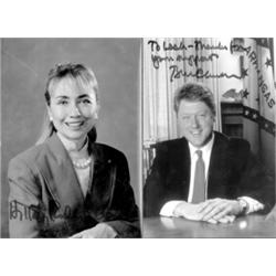 WILLIAM J. CLINTON: (b. 1946) Forty-second President of the United States, the first elected president to be impeached. Fine I.S.P. likely as Governor of Arkansas, 4" x 6" color, showing the future President seated at his desk. Boldly inscribed at top: "To Leah thanks for your support Bill Clinton". Along with a S.P. by Senator and former First Lady HILLARY CLINTON, 5" x 7" b/w, a smiling head and shoulders portrait, boldly signed across the middle. Two pieces, fine condition, ideal for display. $250-350