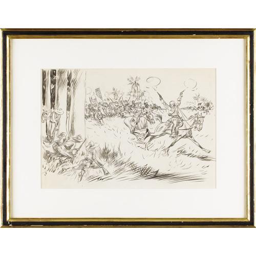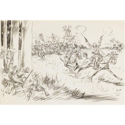 <B>WILLIAM JAMES GLACKENS</B></I> (American 1870-1938)<BR><I>Col. Roosevelt and Rough Riders Charge</B></I><BR>Colored pencil on paper<BR>11-1/2 x 15-1/2 inches (29.2 x 39.4 cm)<BR><BR><BR><BR><b>Shipping:</b> Requires 3rd Party Shipping (<a target="_blank" href="http://www.heritageauctions.com/common/shipping.php">view shipping information</a>)