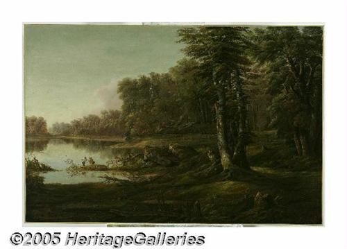 <B>WILLIAM LOUIS SONNTAG (American 1822- 1900)</B></I>Landscape with Fishermen, 1852<BR>Oil on canvas<BR>32in. x 48in.<BR>Signed and dated lower left<BR>Provenance:Alexander Gallery, New York<BR><BR>Condition Report: Canvas has been beva-lined and restretched on a new stretcher, 3in. tear in lower right under large tree, entire sky area overpainted, extensive overpaint in pond particularly lower area under figures.<BR><BR>David Dike: Item is unframed. Agree with description, artist and value estimate.<BR>Brian Roughton: I think this is by Sonntag because of the early date.<BR>