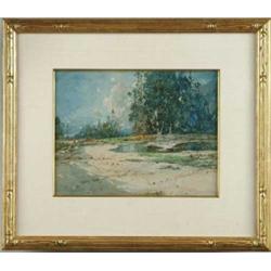 Lot # 1529 WILLIAM LOUIS SONNTAG JR. (American, 1869-1898) BEACH WITH TIDAL POOL. Coastal watercolor shows beach area with tall trees and fence having two tidal pools surrounded by sand. . Signed lower left âWL Sonntag 93â. Housed in carved gilt wood frame with linen matte having a gold liner. SIGHT SIZE: 9-3/4â x 11-1/2â. CONDITION: Very good. 9-99584-1 (1,000-2,000)