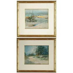 Lot # 1528 WILLIAM LOUIS SONNTAG JR. (American, 1869-1898) SUNSET BEACH. Coastal watercolor shows sandy beach area with rocks and wood structure. Setting sun with yellow and blue sky. Signed lower left “W. L. Sonntag 92”. Housed in carved gilt wood frame with linen matte having a gold liner. SIGHT SIZE: 9-3/4” x 11-1/2”. CONDITION: Very good. 9-99584 (1,000-2,000)