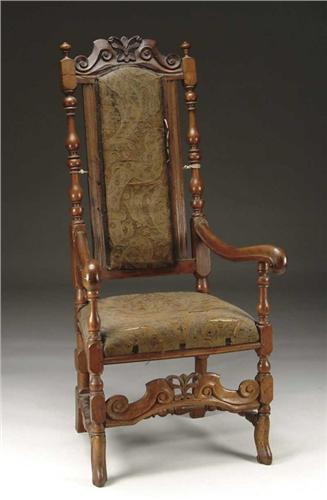 WILLIAM & MARY ARMCHAIR. Upholstered panel back and upholstered seat. The front and back stiles with vase, ring and ball turnings. Nicely carved and decorated crest, scroll carved arms. Front flat carved stretcher mimics carving on crest. Carved Spanish type scroll feet. PROVENANCE: From a Salem, Massachusetts home. SIZE: 52-1/2” h x 25-1/2” across arms x 19” seat h. CONDITION: Originally had cane seat and back. Back is as is with repairs and restoration. 9-26556