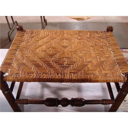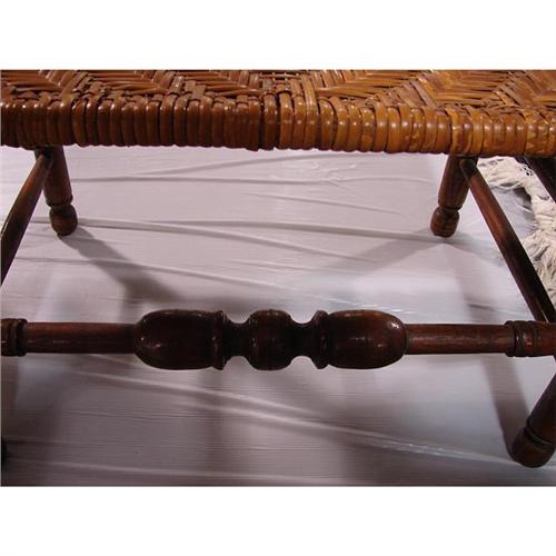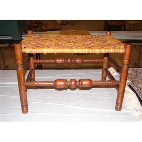 WILLIAM & MARY MAPLE FOOTSTOOL. With elaborately turned stretcher & rush top. 40.25” H, 20.75” L, 14.5” W.