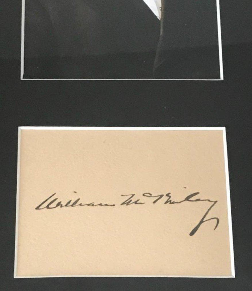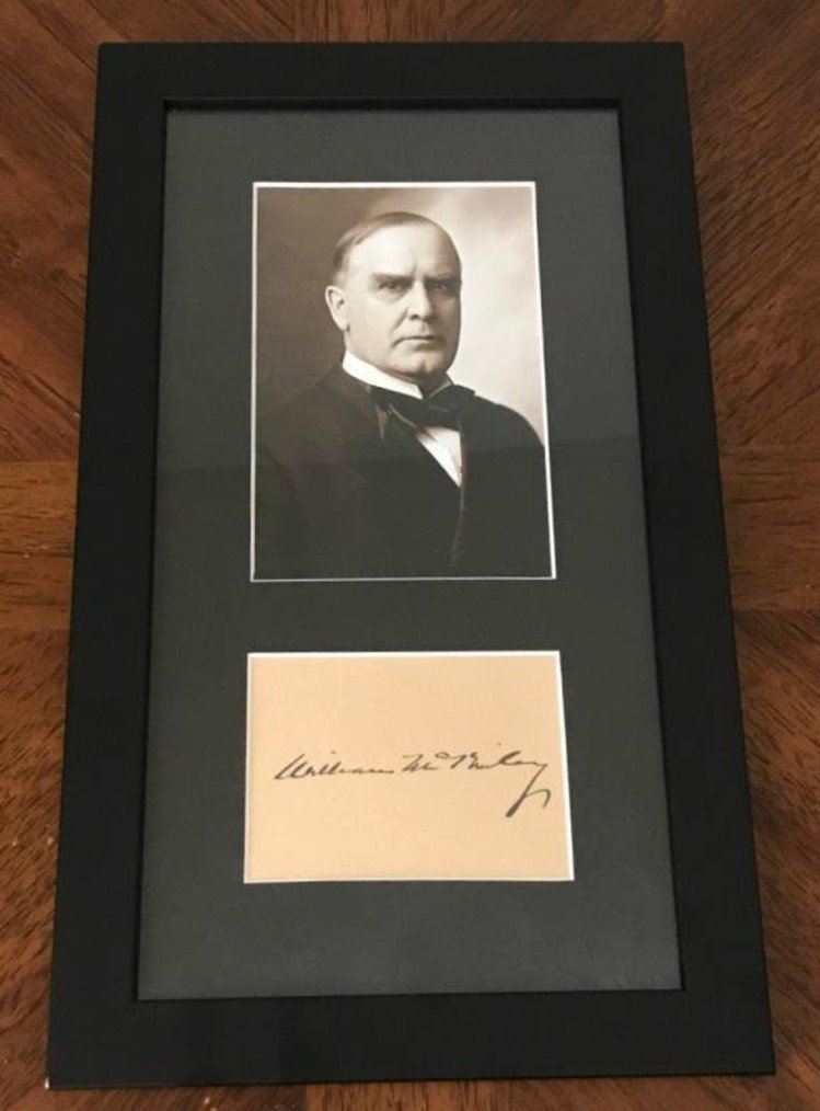 A piece of paper signed by the 25th US President William McKinley. Professionally mounted and framed in black ramen wood, and supplied with coa. William McKinley was an American politician and lawyer who served as the 25th President of the United States from March 4, 1897 until his assassination in September 1901, six months into his second term.