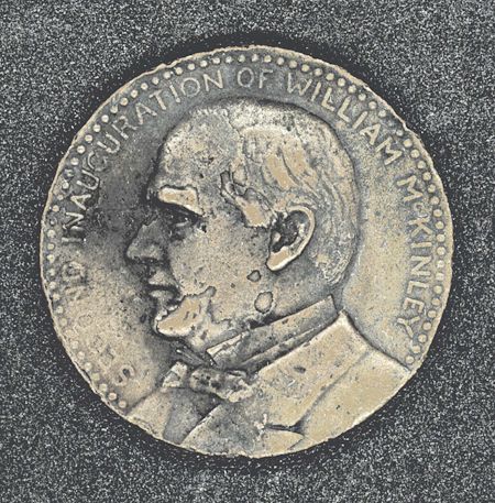 Scarce example of the Official March 4, 1901 Presidential inaugural medal honoring the election of William McKinley and Theodore Roosevelt. This is only the second official medal issued in commemoration of an inauguration and according to Richard A. Dusterberg, author of The Official Inaugural Medals of the Presidents of the United States: "...the medal was distributed only to members of the Inaugural Committee. It received no publicity. Even the sculptor's name was never recorded. It was intended as a pocket piece - a souvenir - nothing more". Harry J. Foreman, the great numismatist, was very adamant when he stated: "without doubt it would be highly unlikely more than 50 examples have survived the test of time". This example, regrettably, has faults: unnatural patina, and slight pitting with oxidation to the surfaces (especially on the obverse). We also note unevenness and pitting on the rim. Possibly it is a dug relic discovered by a metal detector enthusiast. On the good side: all lettering is still bold and clear, especially strong on the raised surfaces on the reverse. The bust of McKinley is highly defined despite the roughness of the surface. There is no loss of detail whatsoever to the Capital building, in fact, amazingly, it still has full steps! Estimated accordingly.