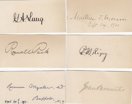 A group of six signatures on small cards of those doctors who tended to McKinley during his last hours. Includes: MATTHEW D. MANN, ROSWELL PARK, HERMAN MYNTER, PRESLEY MARION RIXEY (also personal physician to Theodore Roosevelt), JOHN PARMENTER and G. S. LUNG. Light mounting traces to each card, very good.