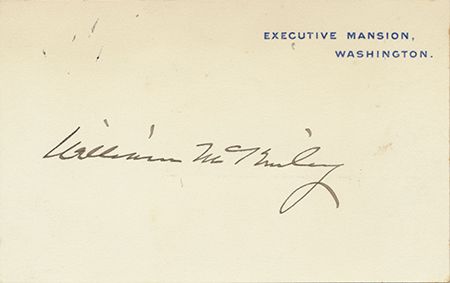 (1843-1901) Twenty-fifth President of the United States, acquired Cuba, Puerto Rico, Guam and Hawaii. Assassinated. Bold signature on an Executive Mansion card. Mounting traces to verso but in near fine condition nonetheless, a good example for display.
