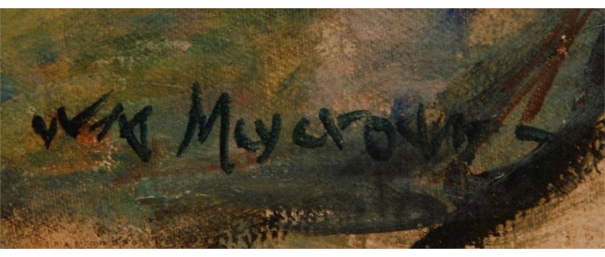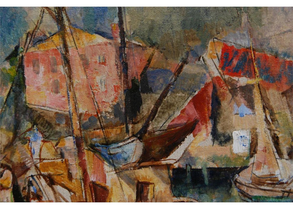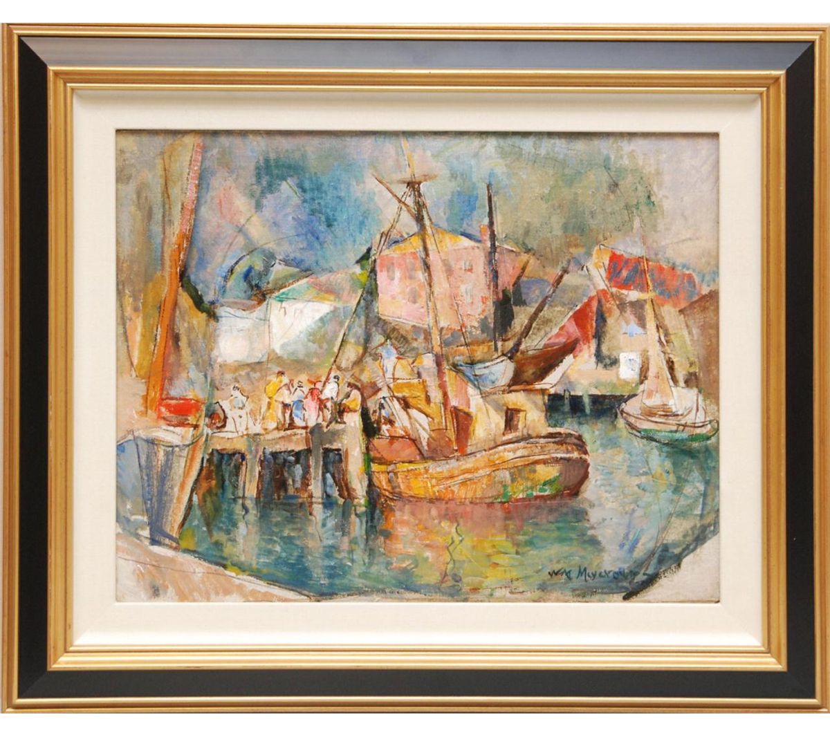 William Meyerowitz (AMERICAN, 1887-1981) oil painting on masonite depicting a harbor scene. Signed 'WM Meyerowitz' to lower right. Mounted in black and gold frame with matting. Measures 15 1/2" height x 19 1/4" width + 3 3/4" mat and frame (39.3cm x 48.8cm + 9.5cm). Provenance: Property of a Stuart, Florida gentleman.