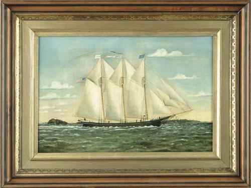 WILLIAM PIERCE STUBBS (American, 1842-1909) SHIP PORTRAIT OF THE “GERTRUDE E. SMITH”. Oil on canvas marine scene shows a three-mast black hulled schooner in full sail going left to right. It is passing Owls Head and approaching Rockland harbor. Five figures on board. Each mast with a flag or banner and American flag off back. Housed in a fine gold lined walnut period frame. PROVENANCE: Barridoff Galleries, July 9th, 1983. SIZE: 16” x 24”. CONDITION: Relined, restored with some inpainting. 9-27055