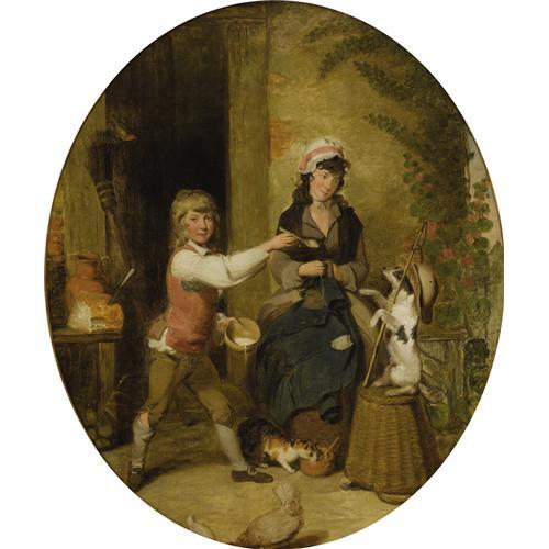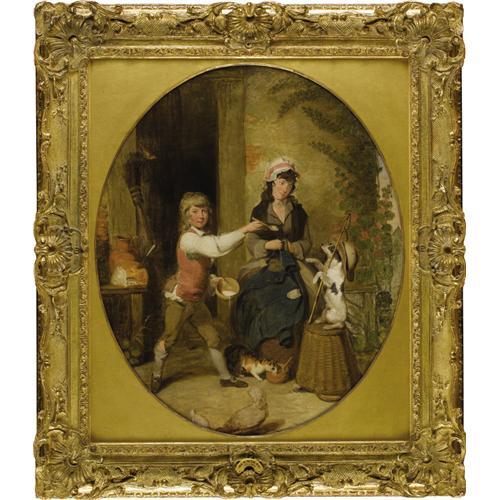<B>WILLIAM REDMORE BIGG</B></I> (British 1755-1828)<BR><I>New Tricks</B></I><BR>Oil on canvas<BR>30 x 25 inches, oval (76.2 x 63.5 cm)<BR><BR>Provenance:<BR>Newhouse Galleries (New York);<BR>Sale, Phillips London, June 3, 1997, Lot 26;<BR>Sale, Sotheby's New York, June 9, 1995, Lot 88<BR><BR> <B>Condition Report:</B> surface cleaned, relined<BR><BR><b>Shipping:</b> Requires 3rd Party Shipping (<a target="_blank" href="http://www.heritageauctions.com/common/shipping.php">view shipping information</a>)