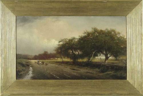 WILLIAM RICHARDSON TYLER (American, 1825-1896) "AFTER THE RAIN". Oil on canvas summer scene shows a landscape with dirt road and farmer and dog herding four cows with house in background along side a large field with other cows, split rail fence with large trees. Signed lower right "W. R. Tyler". Housed in a 5-1/2" w gilt reeded frame. Title and artist name on back of stretcher. SIZE: 22" x 38". CONDITION: Some minor inpainting, very good. 9-26672