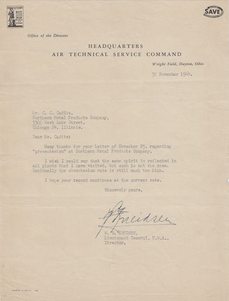 (1879 - 1948) Leading automotive industry executive, commissioned a Lieutenant General in the U.S. Army, the only civilian ever to join the Army at such a high initial rank. He worked as a consultant and troubleshooter for the War Department. T.L.S. on official letterhead, 1p. 4to., Nov. 30, 1944 discussing "presenteeism" vs. absenteeism, which he claims is far too high. Very good.