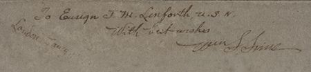 (1858 - 1936) American admiral who instituted great advancements in naval gunnery and adopted the convoy system used in World War I. I.S.P, 8 1/2" X 11 1/2", inscribed at bottom, "To Ensign J. M. Linforth, U.S.N., With best wishes, Wm. S. Sins."Mount toned a bit, photo crisp and beautiful. Double-matted and framed.