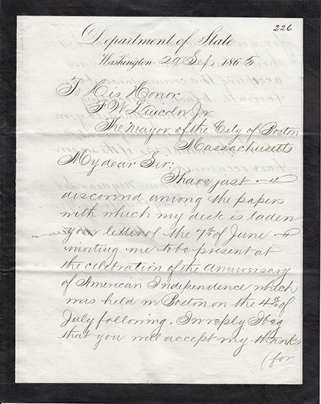 (1801 - 1872) American politician and Lincoln's Secretary of State, responsible for preventing official European recognition of the Confederacy. L.S. 2pp., 4to. on Department of State mourning stationery, Washington, Sept. 29, 1865 Boston Mayor F. W. Lincoln Jr. very belatedly declining an invitation to attend the city's Independence Day celebrations: "…I have just discovered among the papers with which my desk is laden your letter of the 7th of June inviting me to be present at the celebration of the anniversary of American Independence … I beg that you will accept my thanks for your kind invitation which I should have found pleasure in accepting had circumstances been favorable to such a proceeding. Regretting the delay in making this acknowledgment, which the casualties of the season have occasioned…." Seward, of course had been the subject of an assassination attempt in April 1865 and by June was still recovering from the attack. Usual folds else fine condition.