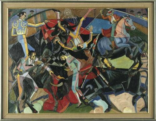 WILLIAM SHARP (American, 1900-1961) "CORRIDA". Oil on masonite modernistic abstract scene of bull fighters and bulls in bull ring. Nice bright colors. Signed lower right "W.S." Back is titled on masonite. Housed in a simple wood molded frame with linen liner trimmed in an inner gold liner. SIZE: 22-1/2" x 30-1/4". CONDITION: Very good. 9-26873