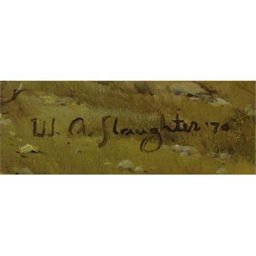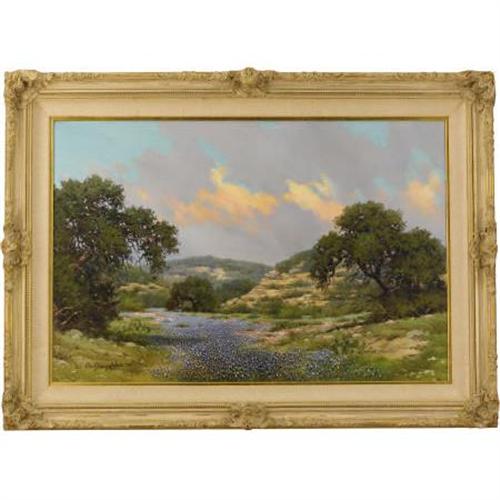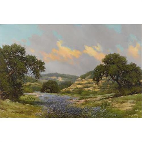<B>WILLIAM SLAUGHTER (1923-2003)</B></I><BR>Untitled Bluebonnets and Rocky Hillside<I>,</B></I> 1974<BR>Oil on canvas<BR>24 x 36 inches (61.0 x 91.4 cm)<BR>Signed lower left<BR><BR> This painting was dedicated by the artist as follows: <I>Best wishes to Charlie and Laverne Martin on the occasion of your wedding. W. A. Slaughter 3/2/75.</B></I><BR><BR>This painting is characterized by excellent composition. Slaughter uses two live oaks and an exposed rocky cliff to direct the viewers eye into the center of the canvas. The sky is characterized by dramatic clouds. In the distance a remote hill can be seen through the hazy moisture-laden atmosphere.<BR><BR>Provenance:<BR>Acquired by descent from the artist by the present owner<B>Condition Report:</B> Excellent condition. Period frame in excellent condition.<BR><BR><b>Shipping:</b> Requires 3rd Party Shipping (<a target="_blank" href="http://www.heritageauctions.com/common/shipping.php">view shipping information</a>)