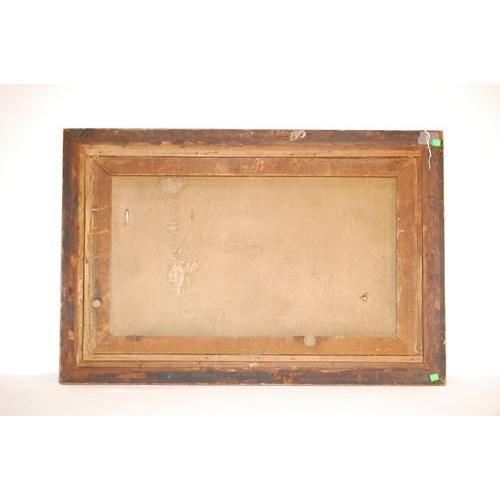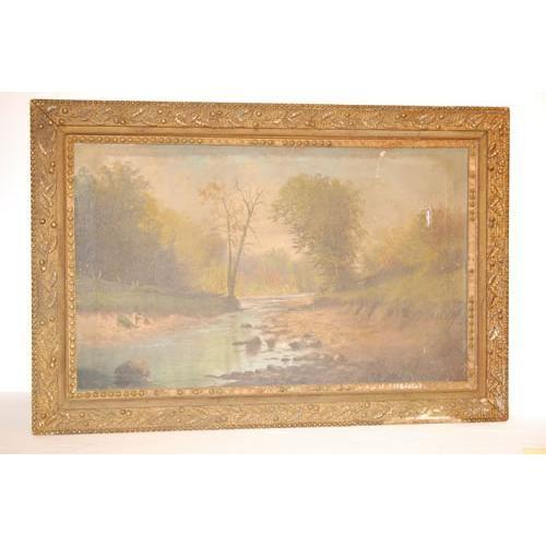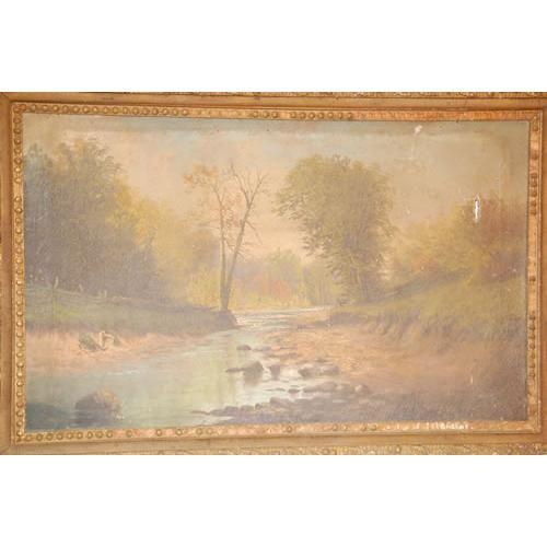 WILLIAM SNYDER PAINTING - OIL ON CANVAS OF WOODLAND STREAM LANDSCAPE-SIGNED WM. SNYDER ON LOWER RIGHT IN A PLASTER MOLDED FRAME (19 1/2" X 32 1/2") - SEVERAL TEARS, SCRATCHES, CRAQUELURE, LOSSES TO FRAME, IMPERFECTIONS