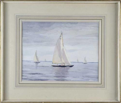WILLIAM T ALDRICH (American, 1880-) “AMERICAN CLASS”. Fine watercolor seascape shows a blue hull racing sailboat with two people aboard and four other similar boats all sailing left to right. Signed lower left “W T Aldrich”. Housed in its original painted and gilt wood frame with thick matte having multiple watercolor and gilt highlighted lines. The back board has original Doll & Richards Boston, Mass” label. Also a London Frame Makers label and states “Property of F. Murray Forbes Jr.”. SIGHT SIZE: 13-3/4” x 17-3/4”. CONDITION: Very good. 9-27823