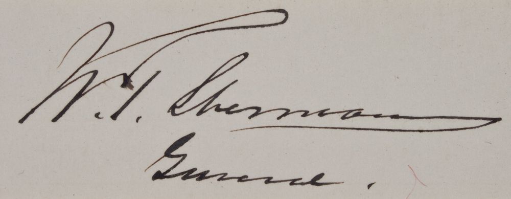 (1820-1891) Union major general declared by the press to be "insane", he led his army in their March to the Sea, taking Atlanta, Savannah and Columbia along the way. Fine bold signature adding rank as general, penned on heavy stock. Professionally matted with a copy of a Prang litho showing Sherman before Atlanta. Sold with a signature and rank of JAMES H. WILSON (1837-1925) Union brigadier general of cavalry who fought with Sheridan at Yellow Tavern and Petersburg, captured Jefferson Davis after his flight from Richmond. Two pieces, fine.