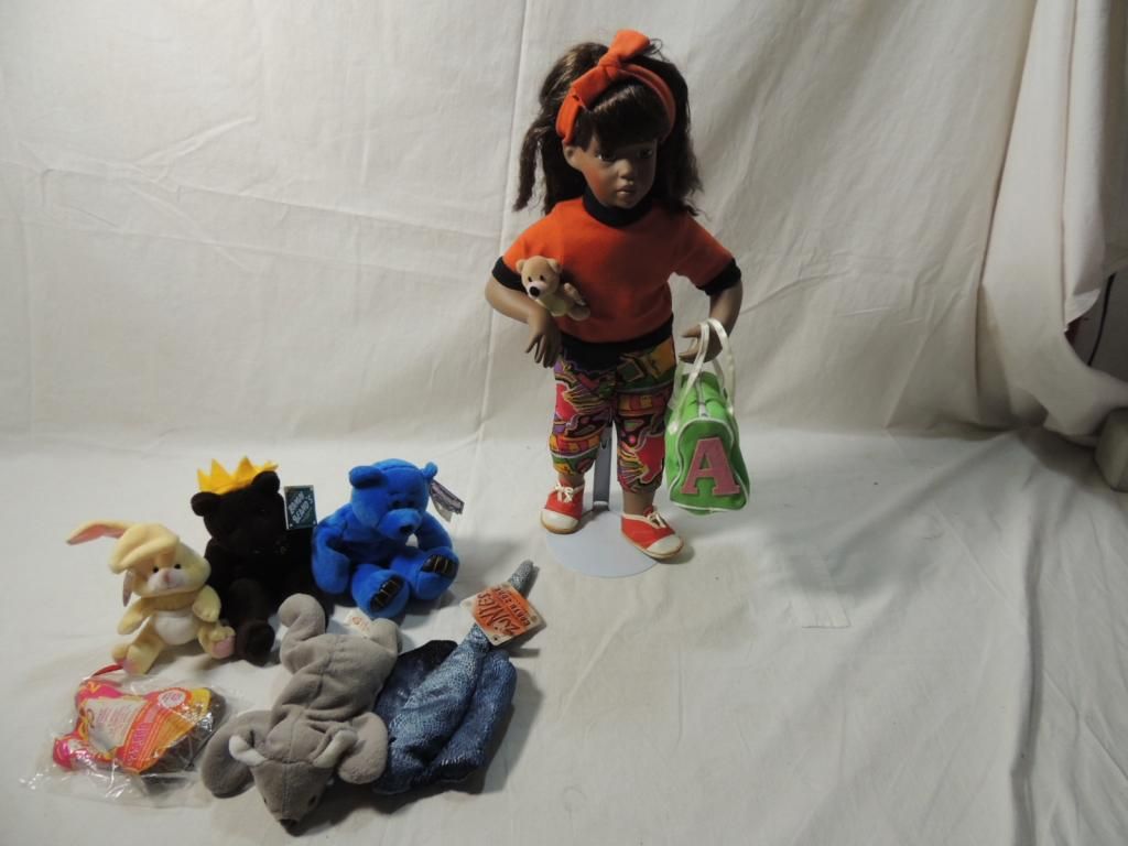 WILLIAM TUNG COLLECTION DEVANNA DOLL. DEVANNA IS GOING TO SPEND THE NIGHT WITH HER BEST FRIEND. 7 BEANIE BABIES INCLUDED. AS SHOWN. SEE PHOTO FOR MORE DETAILS. COLLECTIBLE DOLL. IN BOX. COLLECTORS. GOOD CONDITION. AS SHOWN. SEE PHOTO FOR MORE DETAILS.