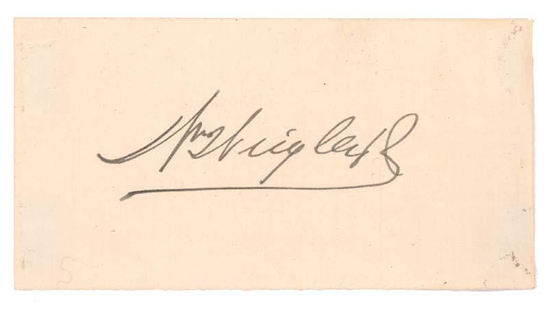 WILLIAM WRIGLEY JR. (1861 - 1932) U.S. chewing gum industrialist. He was founder and eponym of the Wm. Wrigley Jr. Company in 1891. Signed sheet of paper “Wm Wrigley, Jr.”. 4 1/2” x 2 1/2”. Mounting trace on verso. Fine.