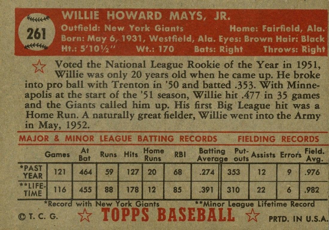 A highly popular baseball card. Willie Mays first appearance in a Topps issue. The card is ungraded.