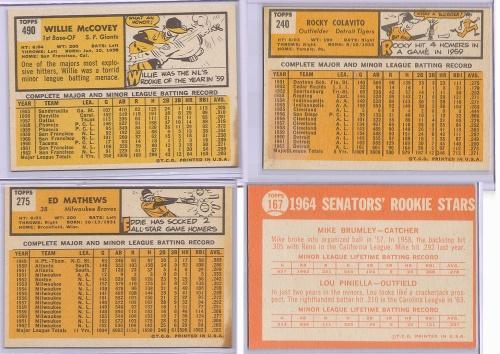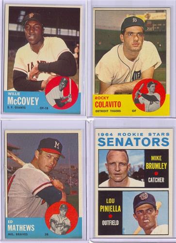 WILLIE MCCOVEY, ROCKY COLAVITO, ED MATHEWS, & LOU PINELLA BASEBALL CARDS. Consists of one Willie McCovey 1963 Topps baseball card. #490. Ungraded. Consists of one Rocky Colavito 1963 Topps baseball card. #240. Ungraded. Consists of one Ed Mathews 1963 Topps baseball card. #275. Ungraded. Also consists of one Lou Pinella 1965 Topps rookie card. #167. Ungraded.