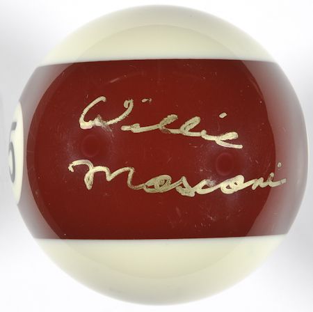 (1913 - 1991) American billiards champion and trick-shot specialist, considered one of the greatest pool players.A neat Mosconi item, an official size and weight number "15" pool ball boldly signed in full by Mosconi in gold sharpie. Very good. From the Goldberg sale of Mosconi's personal effects consigned by his widow, Flora Mosconi, April, 2005.