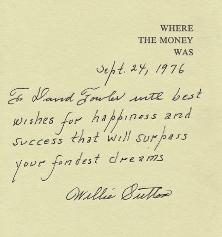 (1901 - 1980) "Willie the Actor", American bank robber of dozens of banks. When asked why he robbed banks, he replied: "Because that's where the money is". A.N.S. penned on the half-title page of his autobiography Where the Money Was (but removed from the volume which is no longer present): "Sept. 24, 1976 To David Fowler with best wishes for happiness and success that will surpass your fondest dreams. Willie Sutton". Fine.