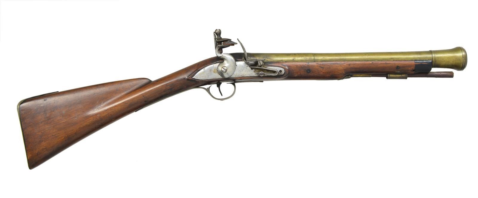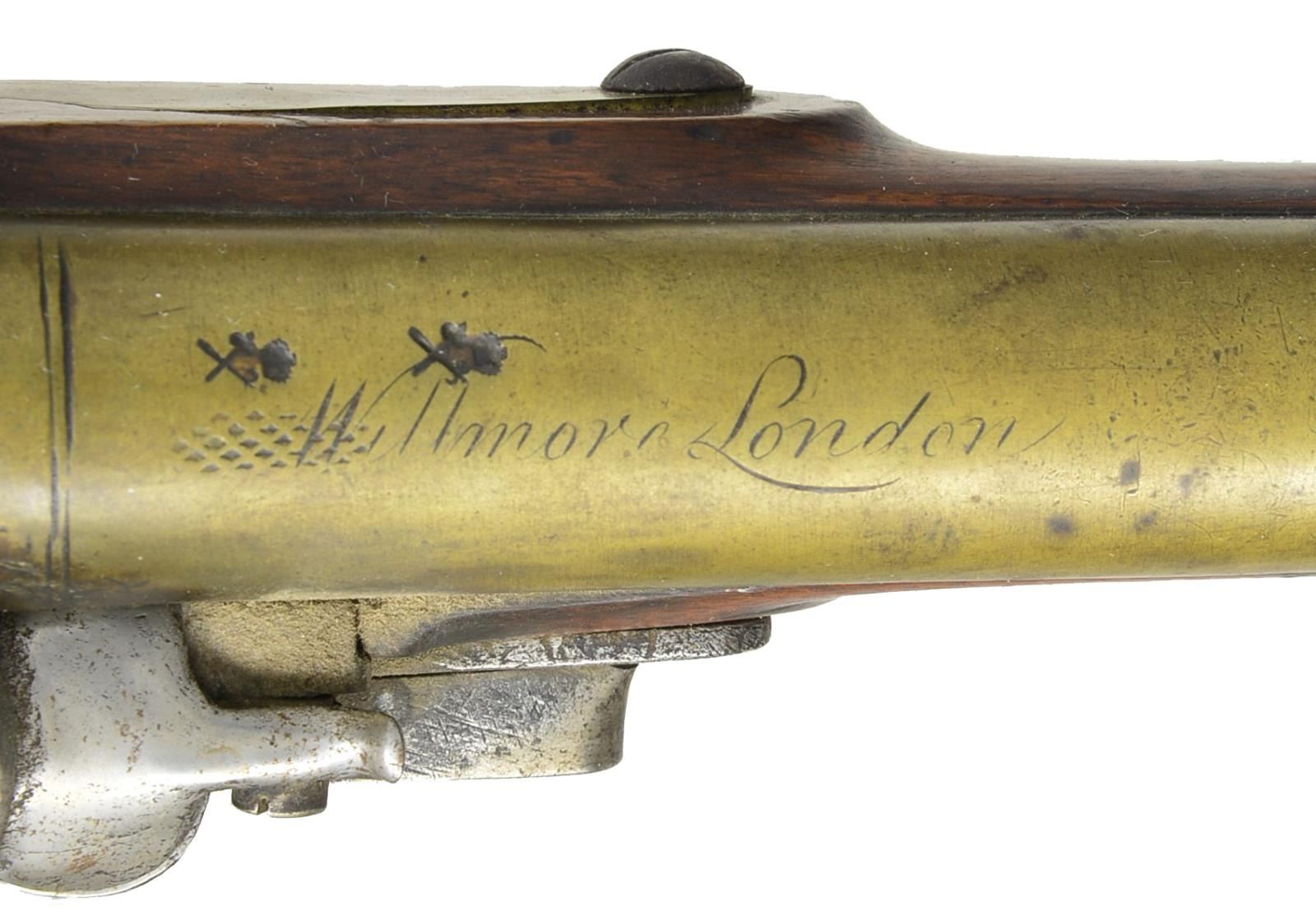 Cal. approx. 58. NSN. Bbl. 14 5/16" of brass w/ faceted transitions & blunderbuss muzzle that flares to 1 1/4". Bbl. marked "WILLMORE LONDON". Iron lock w/ partially visible Willmore markings. Plain trigger. Pin fastened straight grip walnut stock. Brass fittings consist of buttplate, trigger guard, sideplate, thimble & single pipe. Hardwood ramrod. CONDITION: brass has acquired a mild aged patina. Lockplate & hammer show heavy polishing. Stock shows numerous scratches, dents & marks w/ cracks in tip area. Functioning lock. (01-18805/DS). ANTIQUE. $1,200-1,800.