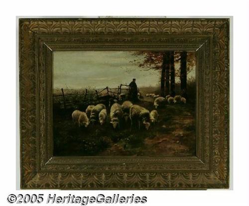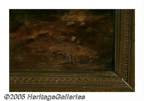 <B>WILLY HOFMANN (German 19th-20th Century)</B></I><BR>Grazing Sheep, 1909<BR>Oil on canvas<BR>15.75in. x 21.75in.<BR>Signed and dated lower right<BR><BR>Condition Report: Unlined original canvas, 3 small tape patches on reverse covering small punctures in canvas, canvas in general deteriorated condition<BR>