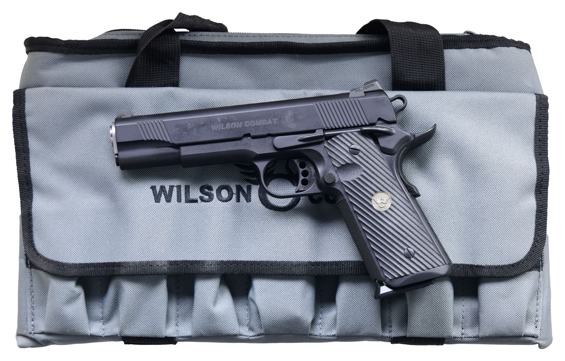 Cal. 45 ACP. S# WCT35994. Bbl. 5". Three dot sights. High end 1911 style pistol with Wilson's Bullet Proof parts. Front & rear slide serrations. Extended beavertail grip safety. Stippled front & rear grip straps. Enlarged mag well. Black Armor Tuff finish. G10 grips with Wilson medallions. MAGS: 1-8 rd. UNATTACHED ACCESSORIES: factory softcase with manual, paperwork & bushing wrench. CONDITION: all aspects near excellent. PROVENANCE: From the Estate of Jon Thomas, Gunsport, LTD. (25-1128/MJC). MODERN. $2000-3000.