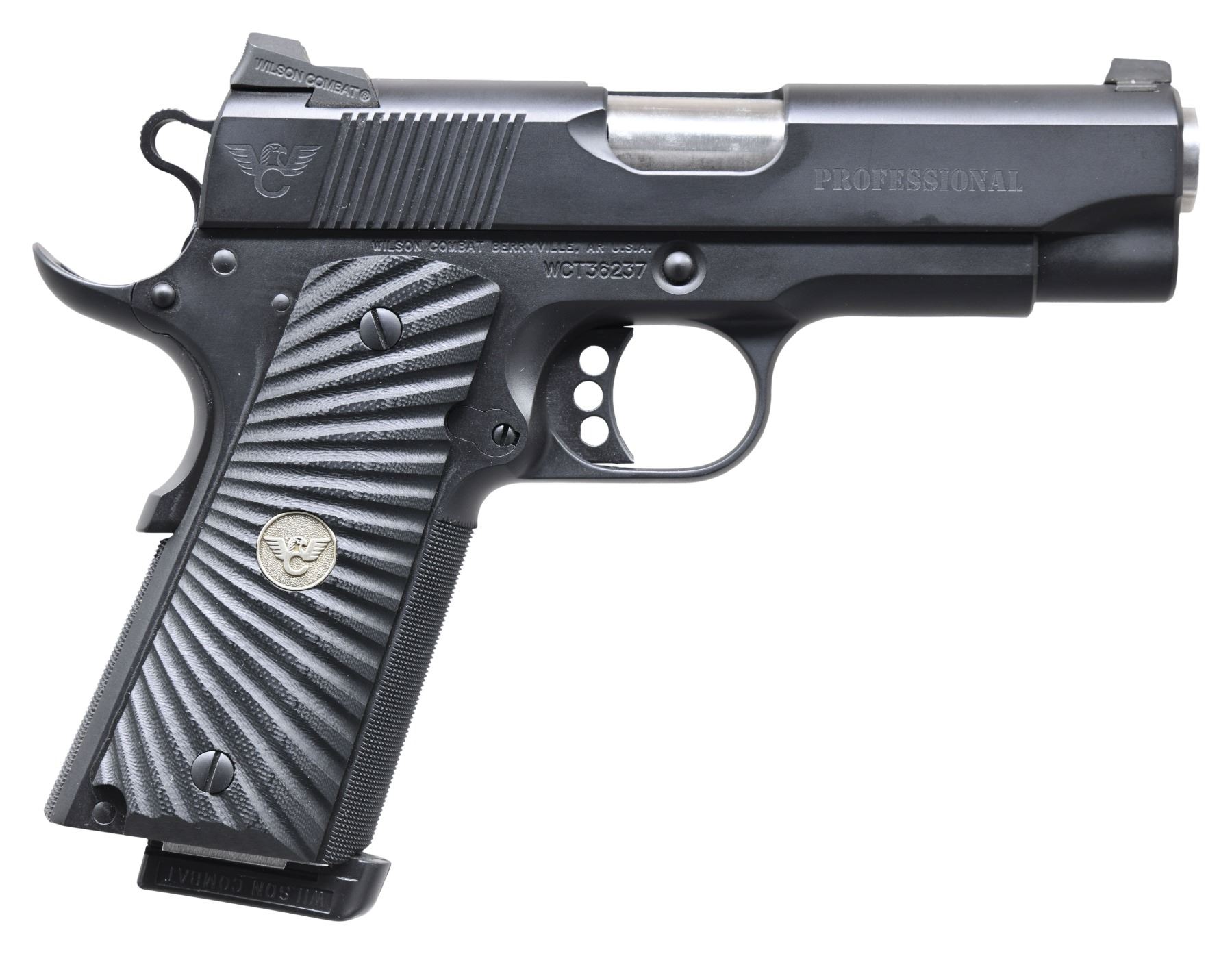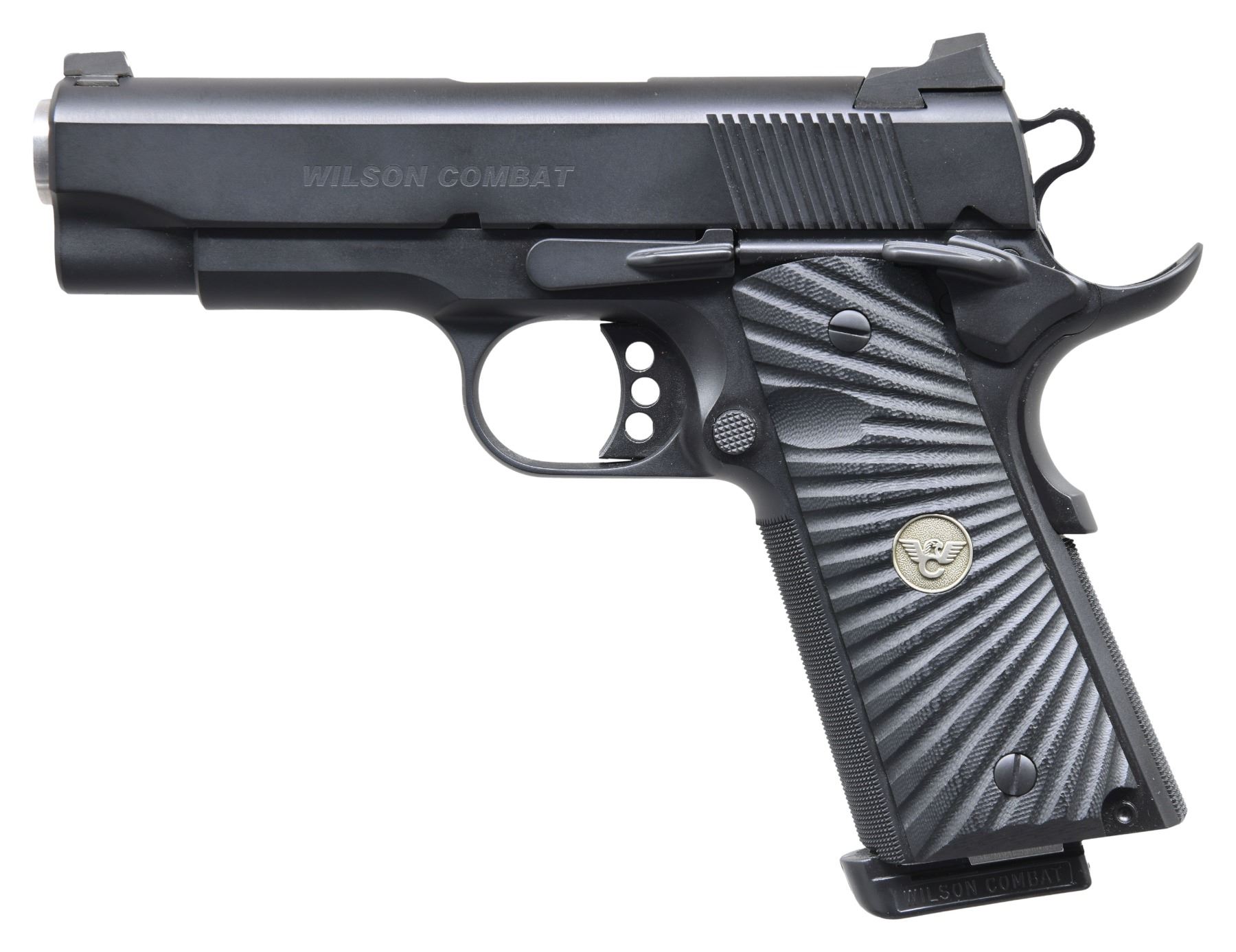 Cal. 38 Super. S# WCT36237. Bbl. 4". Three dot sights. Commander style 1911 Wilson pistol. Extended right handed safety. Stippled grip straps. Extended beavertail grip safety. Black Armor-Tuff finish. G10 grips with Wilson medallions. MAGS: 1-9 rd. Wilson 47SX. UNATTACHED ACCESSORIES: Wilson softcase with 9mm bbl., 9mm recoil spring, manual & paperwork. CONDITION: all aspects near excellent. PROVENANCE: From the Estate of Jon Thomas, Gunsport, LTD. (25-1129/MJC). MODERN. $2500-3500.