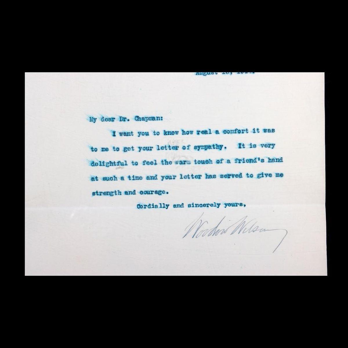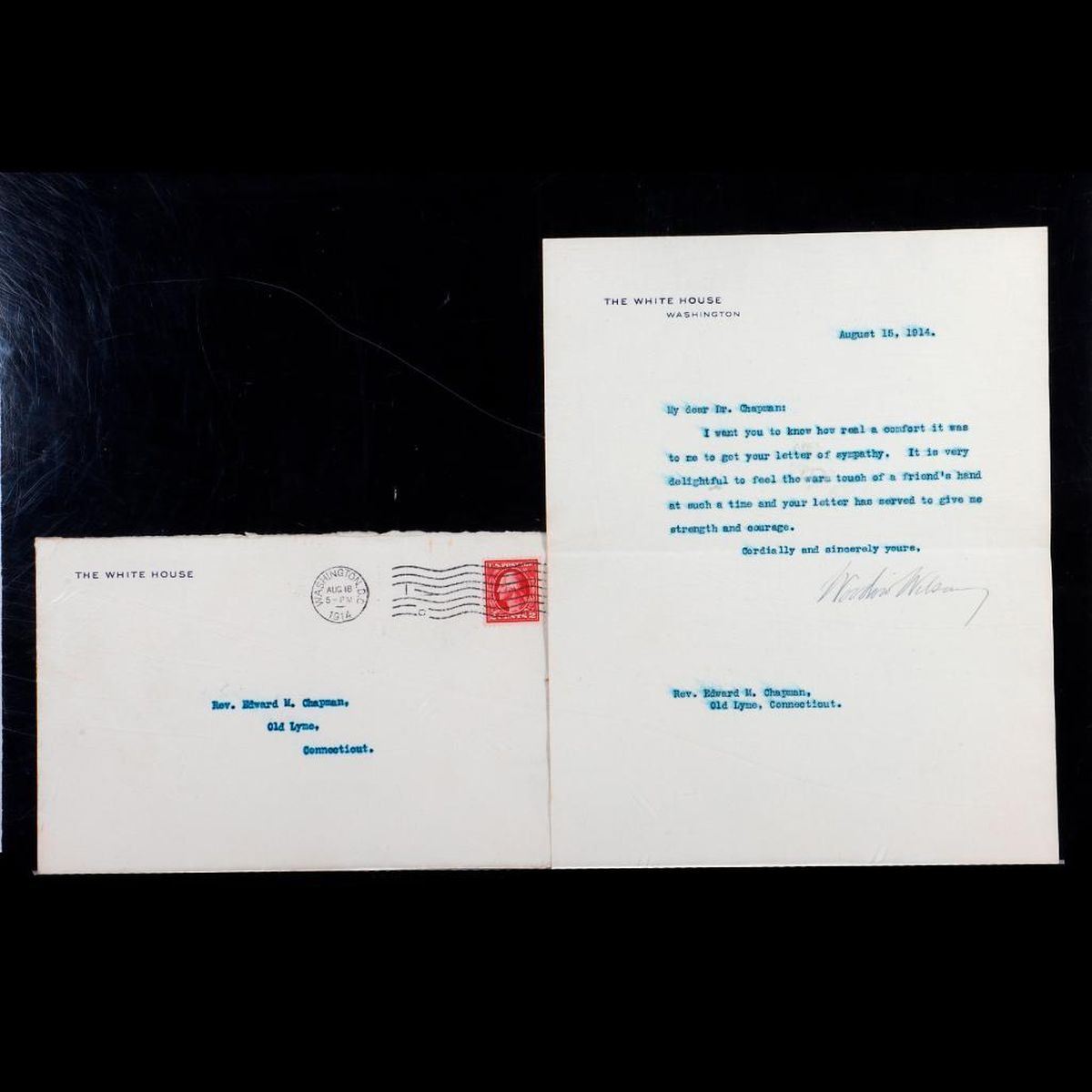 One-sheet TLS, on White House stationery, with franked/stamped envelope, August 15, 1914. The letter is a personal thanks for the condolences sent by Edward M. Chapman, following the death of Wilson's first wife, Ellen Axson Wilson. He writes that it was "delightful to feel the warm touch of a friend's hand at such a time..." 8 3/4in. x 13 7/8in. sheet folded vertically and horizontally. Condition: Good; the type has become blue shadowed/blurred; envelope with light soiling. PLEASE NOTE: 20TH CENTURY DOCUMENTS CAN HAVE VARIED TONING FROM AGE; IMAGES MAY APPEAR LIGHTER ON DIFFERENT SCREENS. EDWARD MORTIMER CHAPMAN (1862-1952) was a Connecticut pastor, academic, and author. He graduated from Yale Divinity School in 1890. Chapman was a descendant of Robert Chapman, one of the first settlers of Saybrook, Connecticut (c. 1635), and he was a chronicler of his family and the area€™s history. He served as pastor of Old Lyme Church from 1906 to 1915. Chapman had a personal acquaintance with Woodrow Wilson, both before and during his U.S. presidency, through the church and time spent in Lyme, Connecticut. This lot and the other Chapman-related documents offered in this sale were part of a collection of his family papers.