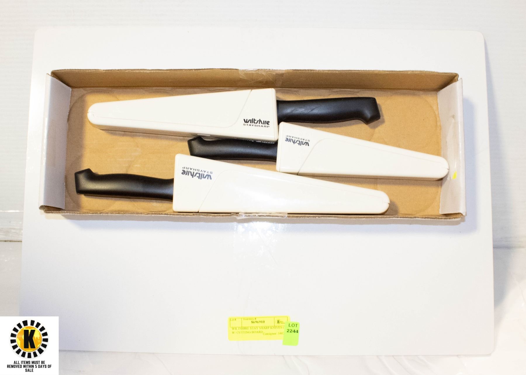 WILTSHIRE STAY SHARP KNIVES (3) W/ CUTTING BOARD