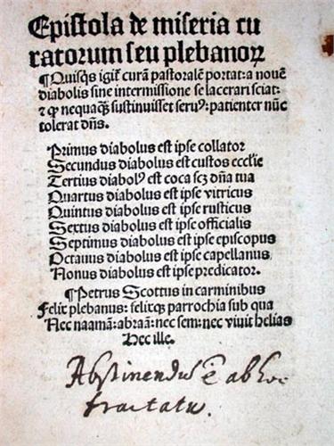[ WIMPFELING, Jakob].- Epistola de miseria curatorum seu plebano[rum]. Colonie [ Cologne], Martinus de Werdena, 1504. In-16° : [16] pp. (mention ms. en marge du titre). Rel. moderne : plein veau brun foncé, plats sertis d'un double filet à froid, supra libros frappé or au centre, dos lisse titré en long, tr. rouges (pet. taches sur les plats)