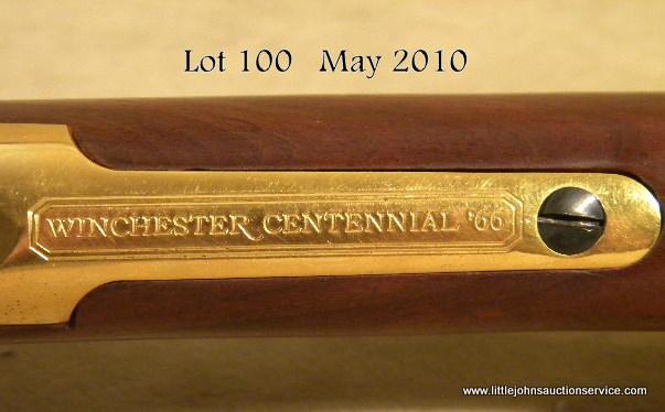 WINCHESER Model 66 Centennial, # 67592, 30-30 cal., 26" octagon barrel, smooth walnut stock. Rifle is in very good condition, showing slight pin pricking on the receiver which should clean, bore is excellent, stock shows handling marks. No box or paperwork. Est. $250-$500.