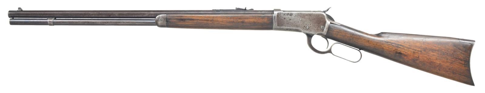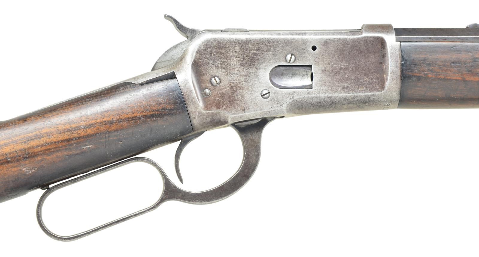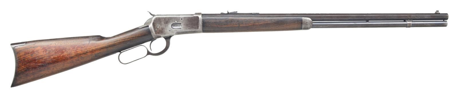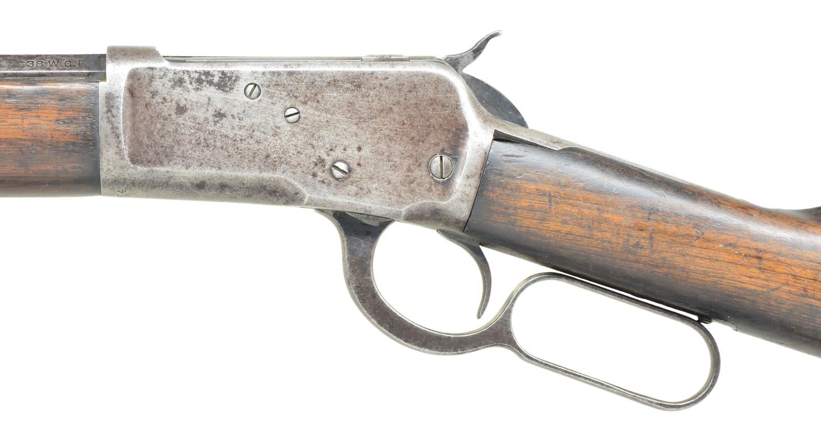 Cal. 38 WCF (.38-40) S# 810564. 24" octagon bbl. Full length mag. Walnut forearm & straight grips stock w/ crescent steel butt plate. Mfg. 1916. CONDITION: Bbl. & mag tube show some light blue fading to brown W/ spotted light corrosion. Receiver is fading to gray showing scattered spots of corrosion. Wood has worn appearance showing numerous scratches & dents. Stock has chips on both side of top tang. Bore retains sound rifling showing scattered light pitting. (21-4061/DS). CURIO. $700-1000.