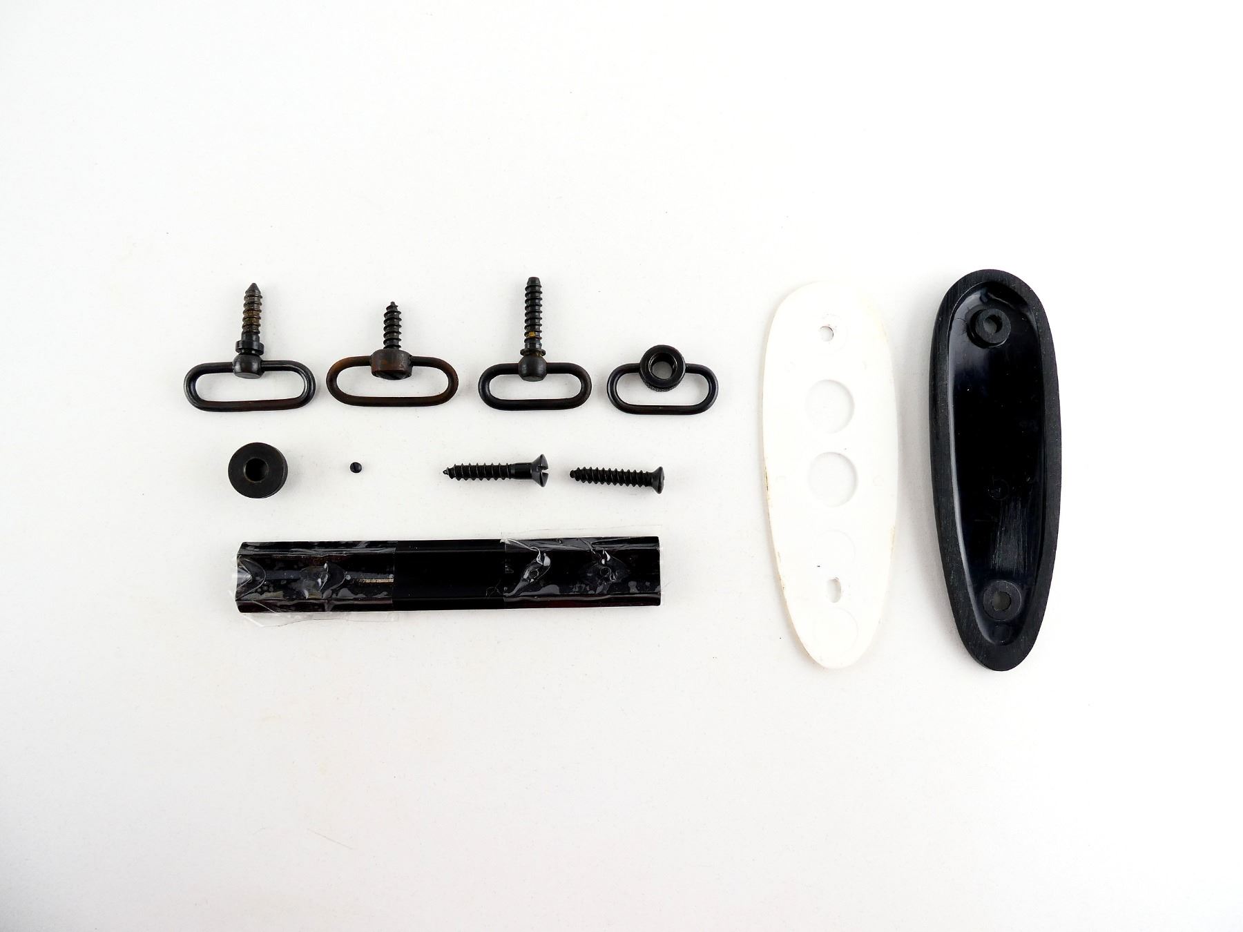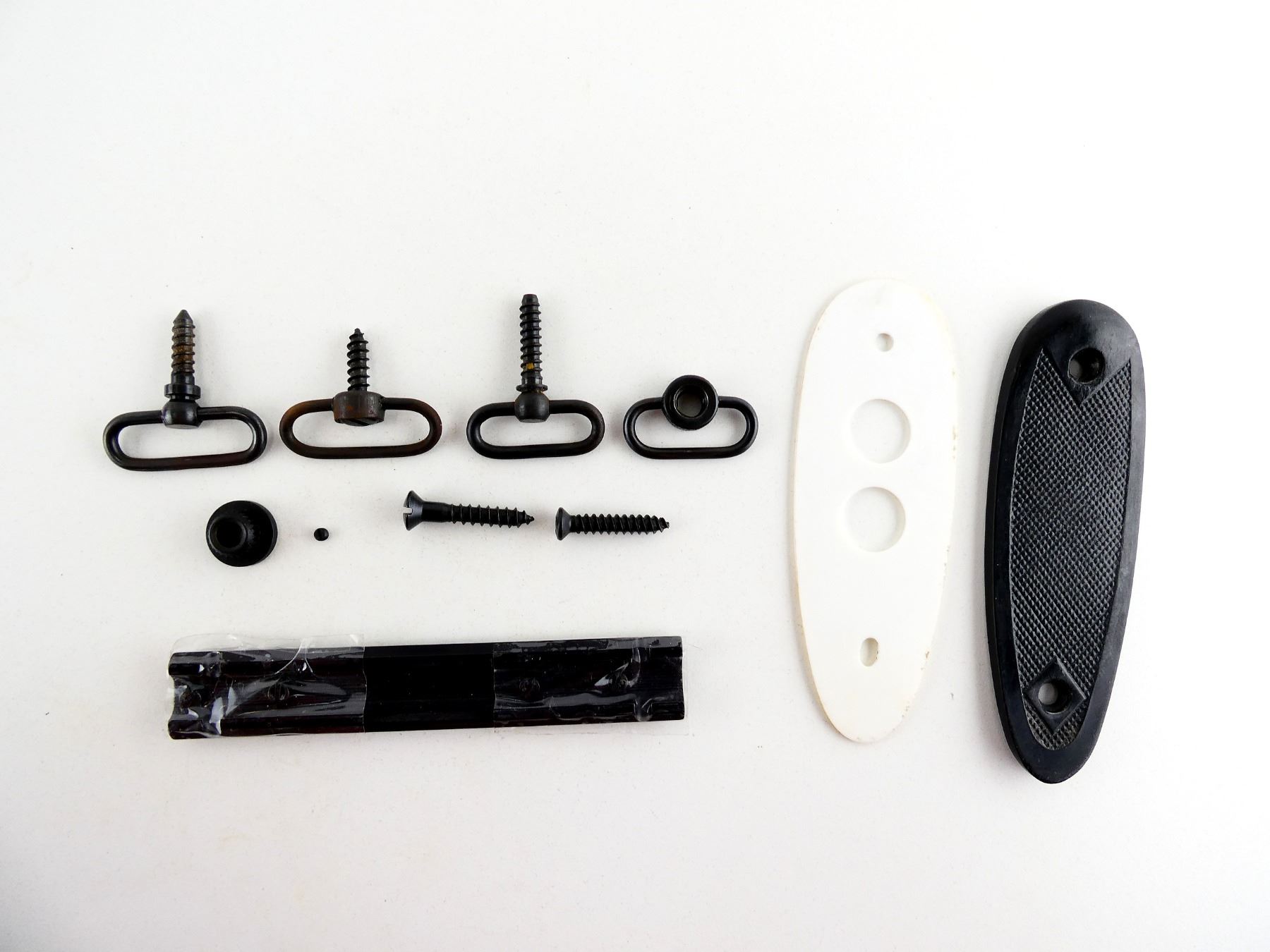 LOT INCLUDES; BUTT PLATE, SWIVELS, 1-PIECE SCOPE BASE WITH SCREWS, ETC. MAY REQUIRE FITTING. SEE PHOTOS.