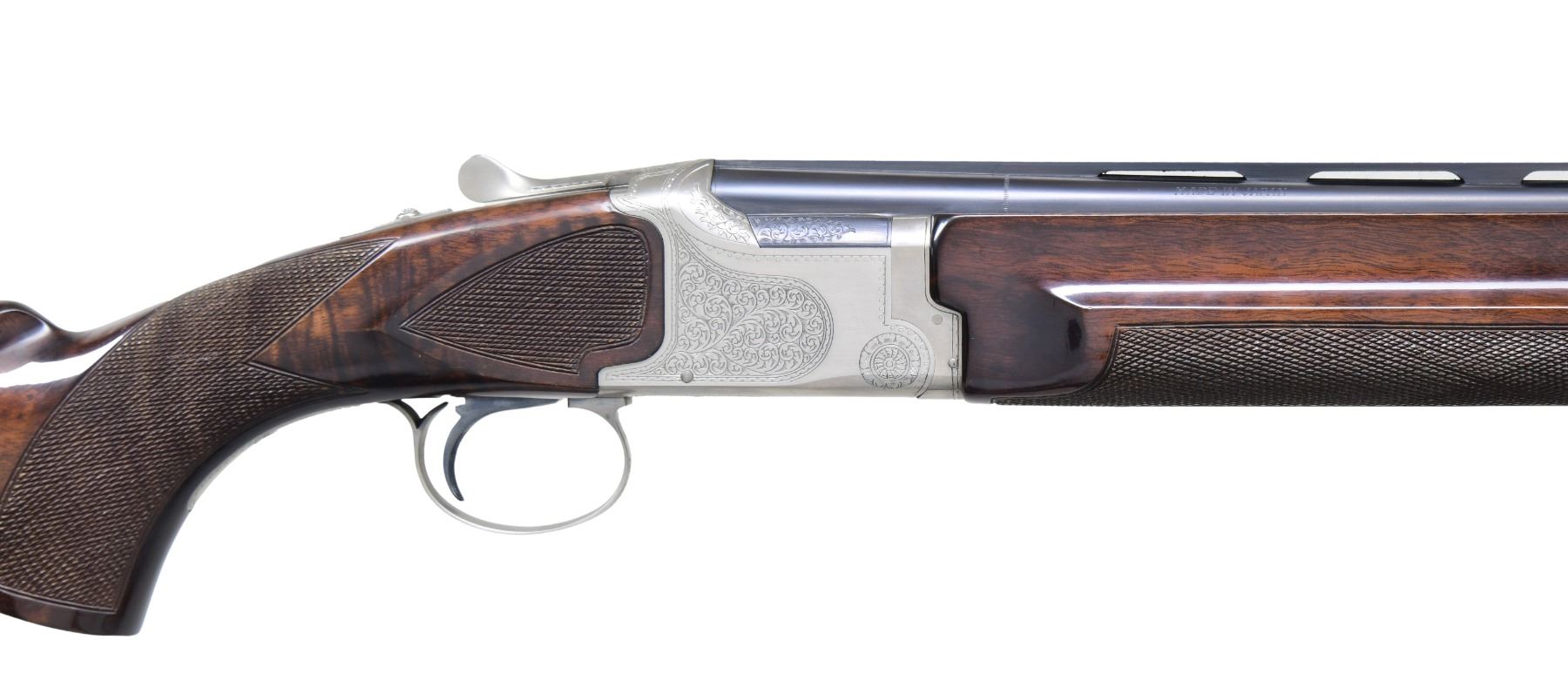 Cals. 410 2 1/2", 28 ga. 2 3/4" & 20 ga. 2 3/4". S# PK264335. All bbls. are 28" vent rib w/ fixed Skeet & Skeet chokes. White target front sights & mid beads. All three bbls. have individual checkered walnut forearms. Satin silver finished boxlock action w/ scroll ornamentation w/ a Pigeon on the floorplate. Checkered SST. Selective ejectors. Uncapped pistol grip walnut stock w/ checkered wrist & ears. LOP: 13 7/8" over original buttplate & white line spacer. DAC: 1 5/8". DAH: 2 3/8". Neutral cast. WEIGHT w/ 20 ga. bbls: 6 lbs, 5 oz. UNATTACHED ACCESSORIES: yellow vinyl covered three bbl. set luggage case. CONDITION: action & all bbls. retain over 97% original finish. Original high gloss stock & forearm finish shows a few small handling marks. Tight sound action. All bores are very good & bright. (25-769/DS). MODERN. $3,000-5,000.