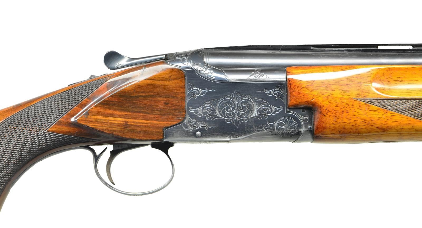 SHOTGUN. Cal. 12 Ga., 2 3/4". S# 101774. Bbls. 30" VR with black target front sight & steel bead. Barrels have aftermarket Briley interchangeable chokes. 2 extended skeet & skeet chokes included. Original choke markings are full & full. Blued boxlock action with scroll ornamentation. SST. Ejectors. Checkered walnut forearm. Original checkered walnut stock with steel grip cap has an added adjustable comb & Graco adjustable buttplate with solid black Kick-Eez pad. Mfg. 1968. UNATTACHED ACCESSORIES: Briley aluminum case with black velour interior. Briley full length skeet tubes in 410, 28 ga. & 20 ga. Accessories include 2 extra Briley choke tubes for each gauge, choke tube wrenches in Briley boxes, hammer, tube seating tool & Allen wrenches. CONDITION: 80% lightly worn blue showing carry & edge wear. Wood finish shows scattered scratches & marks. Barrels have lengthened forcing cones & very good bores. Sub gauge tubes are in very good condition. (22-2105/DS). CURIO. $2,250-3,000.