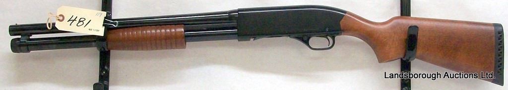 NON-RESTRICTED, PUMP ACTION, 12GA X 3", 18" BARREL WITH FIXED OPEN CHOKE, SN L2557611. WOOD AND BLUE LIKE NEW, BORE HAS SOME STREAKING.