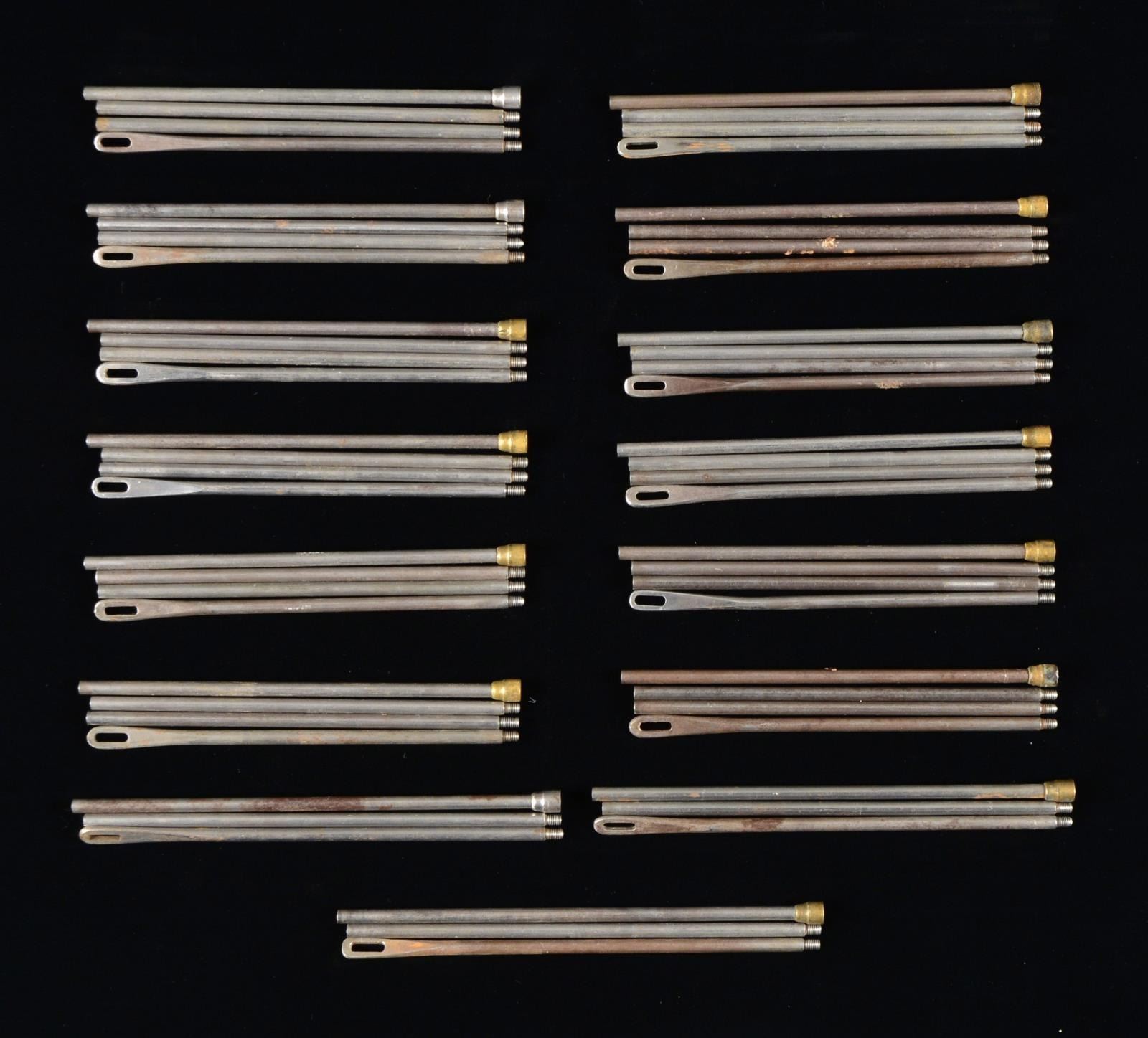 Fifteen total 3 or 4 piece sets that are assembled from loose sections, all are approx. the proper .234" diameter for Win. rods & conform to correct general specifications. Lot includes: 9 four piece rifle rod sets consisting of 1 - 6 7/8" slotted tip, 2 - 6 3/4" center sections & 1 - 7 1/4" brass tipped handle. / 2 Four piece rifle rod sets of steel tip variation. / 3 Three piece carbine sets consisting of 1 - 7 1/2" slotted tip, 1 - 7 1/2" center section & 1 - 8" brass tipped handle. / 1 Three piece carbine set of steel tip variation. CONDITION: varies from smooth cleaned appearance to those showing a darkened appearance w/ spots of light corrosion. A few have slight swelling at end of female threads. PROVENANCE: Ex. Ray Bentley Collection; Vicente Sepulveda Collection. (02-13170-4/DS). $1,500-3,000.