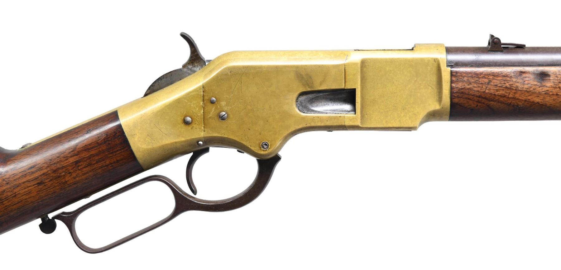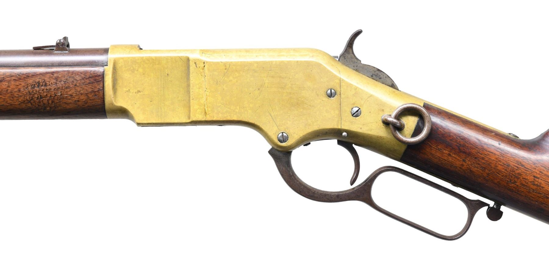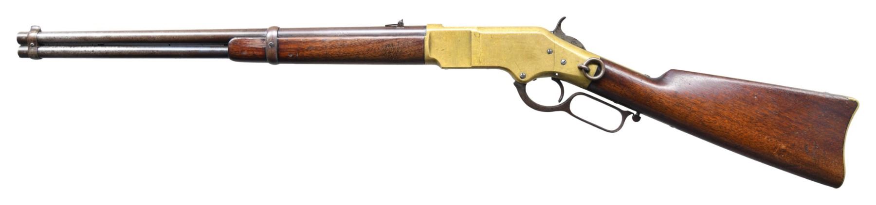 Cal. 44 HRF. S# 148621. Bbl. 20". Bbl. band mounted front sight w/ a non-adjustable leaf rear sight. Action has staple-fastened saddle ring on left side. Band fastened carbine forearm & straight grip walnut stock w/ brass carbine trapdoor buttplate. 1878 manufacture. UNATTACHED ACCESSORIES: three piece cleaning rod held in stock compartment. CONDITION: bbl. & mag. tube show a light brown patina w/ scattered spots of freckling. Brass receiver shows a pleasing mild patina. Original stock & forearm finish shows light to moderate wear with scattered handling marks. Mechanically fine. Dark frosted bore retains deep, sharp rifling & small spots of light pitting. (01-27041/DS). ANTIQUE. $6,000-8,500.