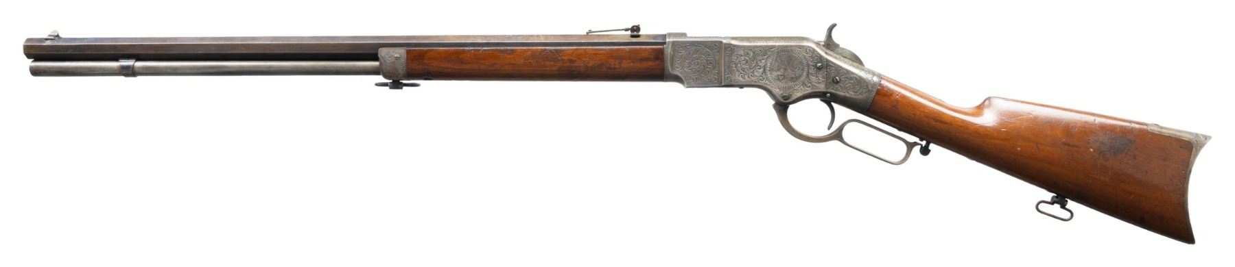 ACTION RIFLE. Cal. 44 HRF. S# 118114. S# is followed by lightly marked "100". Bbl. 24" octagon. Sporting front sight w/ graduated leaf rear sight. Full length mag. Silver finished action has unsigned period hand engraving in the style of Louis D. Nimschke. Receiver sides feature foliate scroll w/ punch dot backgrounds. Vignette on left sideplate shows two quail. Right side has an open circle ready for an added inscription. Forearm cap & trapdoor crescent buttplate have complimentary engraving & silver plating. Walnut forearm & straight grip stock w/ sling swivels. Left inside of lower tang is stamped "X W". Top tang tamp channel of stock has assembly number: "8114". UNATTACHED ACCESSORIES: three piece cleaning rod in stock compartment. CONDITION: bbl. blue fading to a mottled brown appearance. Mag. tube has light gray coloration. Action retains nearly all silver finish having acquired a pleasing dark tarnish. Original stock & forearm finish show dents, marks & wear spots. Bore retains sound rifling showing spots of light pitting. (01-26398/DS). ANTIQUE. $12,000-18,000.