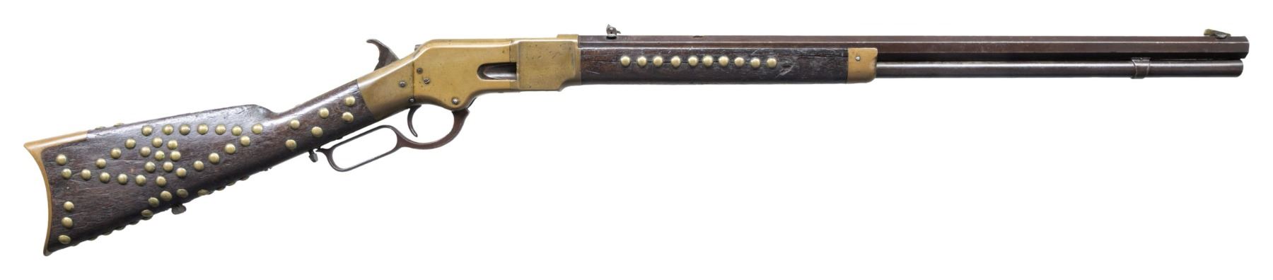 ACTION RIFLE. Cal. 44 HRF. S# 37400. Bbl. 24" octagon. German silver blade Rocky Mountain front sight. Graduated leaf rear sight is shortened with removal of the leaf. An additional dovetail is cut through the markings 3 1/8" forward of the rear sight. Full length tubular mag. Brass action, top tang has 1/4" diameter added hole forward of the tang screw for apparent use with a lollipop style tang sight. Walnut forearm and straight grip stock with brass trapdoor crescent buttplate. Stock and forearm have ornamentation consisting of 20 tacks on the forearm and 91 tacks on the stock. Tack ornamentation is often associated with Native American use. Left inside of lower tang is stamped with assembly # "0". The forearm cap has open hole for sling swivel attachment. Rear sling swivel is cut off leaving the screw attached base and pin. UNATTACHED ACCESSORIES: handwritten letter signed by Ron Kudryk describing the rifles history and configuration with mention of the Wild West Museum in Virginia City, NV. CONDITION: bbl. and mag. tube have faded to gray showing handling marks and spots of corrosion. Brass action has a dark mottled tarnish showing scratches, marks, and small dents. Wood has dark worn appearance. Forearm has large cracks along both sides. Stock is chipped on both sides of the top tang and at the buttplate toe. Action has broken extractor with otherwise functioning mechanics. Dark heavily pitted bore. PROVENANCE: The Esteemed Norm Greenberg Collection. (01-27715/DS). ANTIQUE. $4,000-6,000.
