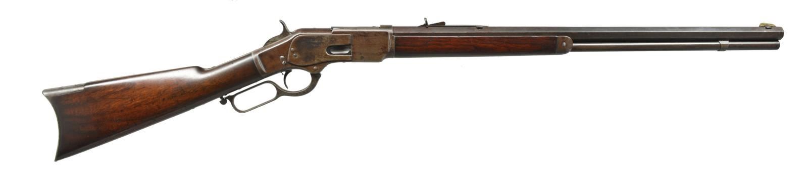 Cal. 44 WCF. S# 10132. Bbl. 24" oct. w/ Rocky Mountain front sight & sporting rear sight. Full length mag. Set trigger. Replacement thumb print dust cover. Walnut forearm & straight grip stock w/ crescent steel trapdoor buttplate. 1875 Mfg. UNATTACHED ACCESSORIES: 3 piece cleaning rod in butt. CONDITION: bbl. & action have a mottled brown patina appearance w/ areas of light pitting. Wood has lightly cleaned finish showing handling marks. Bore has worn rifling showing scattered pitting. (01-17891/DS). ANTIQUE. $4,500-6,500.